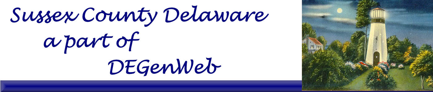 Outside Links If you have any Sussex Co records, family groupsheets, photos, etc. that you can share, please send them to me and I will add them to this site. I do not live in Delaware so am unable to do personal research for you other than lookups in any Sussex Co. books I may have. Last Update