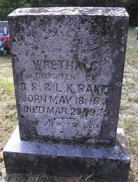 Baker, Wretha C born May 18, 1915; died Mar 25, 1923; Dau of R S & L K Baker