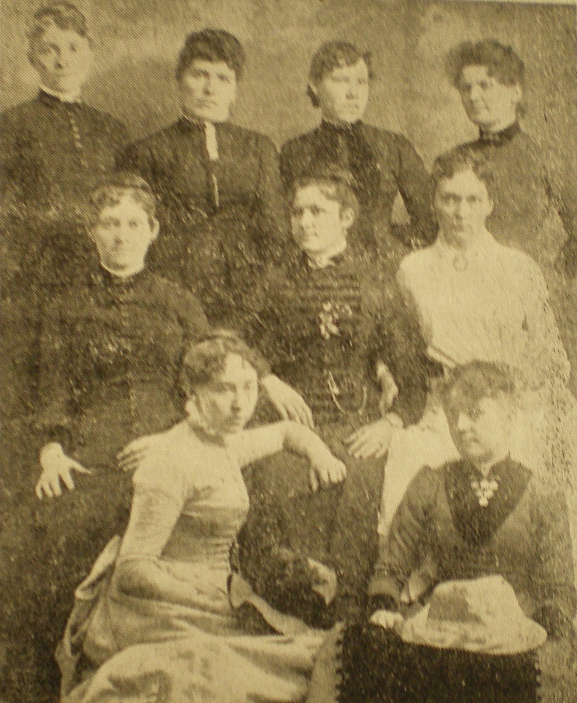 Milton Women's Christian Temperence Union, which was started in 1889 by Jennie Creamer. This is a photo of her with her group. Hannah Black Lacey is standing on left end [Lillian Cade stands beside her]. Sarah Lofland [is seated? on] end Left.